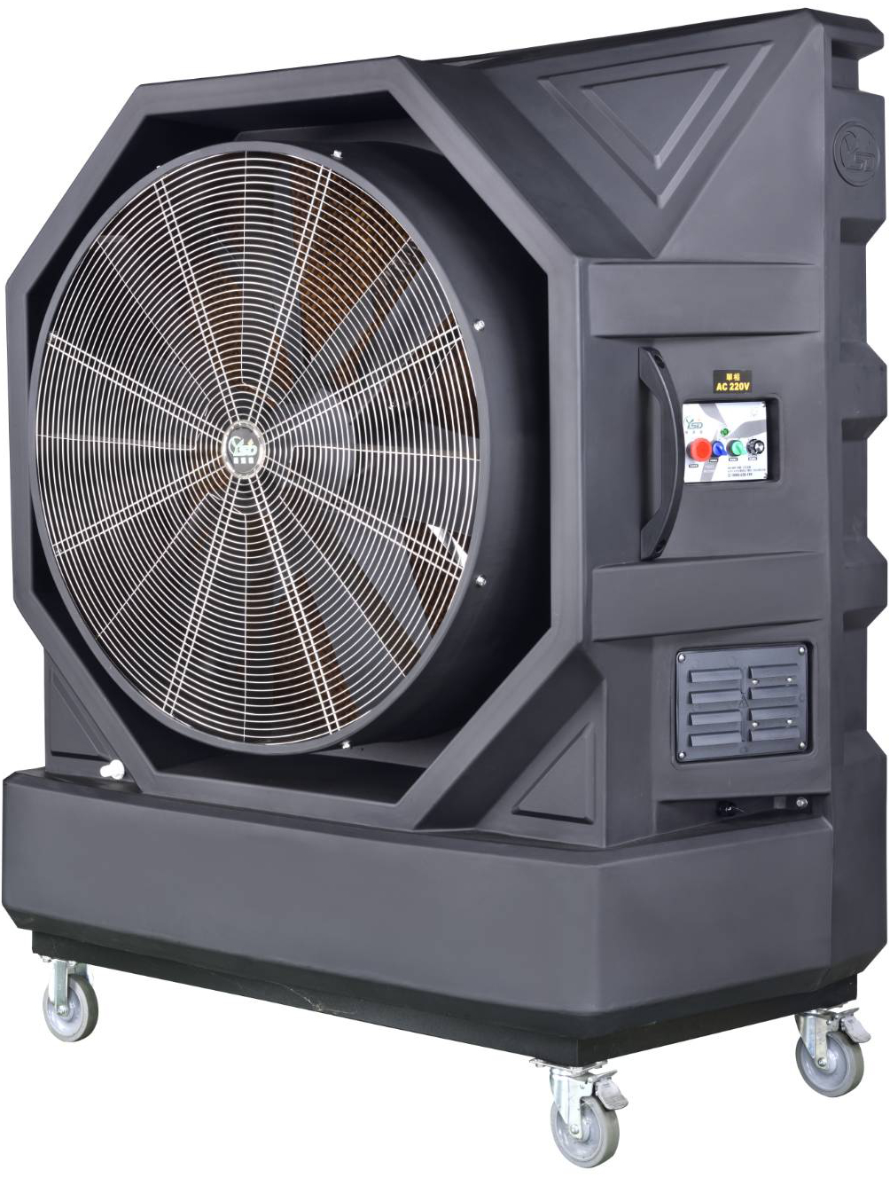 O Ya Suh Dar M602-COOL é um arrefecedor adiabático portátil e de baixo consumo energético, ideal para aplicações comerciais. Este equipamento Plug & Play garante temperaturas agradáveis em fábricas, zonas industriais e de produção, restaurantes e hotéis. Adequado para áreas até 300 m², com uma capacidade de circulação de ar de 32.000 m³/hora. É indicado tanto para espaços interiores como exteriores. Este sistema de arrefecimento utiliza a evaporação da água para arrefecer o ar ambiente, tornando-se assim uma solução ecológica e altamente eficiente. Além de refrescar o ambiente, o arrefecedor filtra poeiras e impurezas, promovendo um ar mais limpo. O visor digital torna a operação simples e intuitiva, e a velocidade do ventilador é ajustável de forma contínua. O modelo inclui ainda lamelas móveis elétricas, que podem ser ativadas ou desativadas para alargar o alcance do fluxo de ar. A manutenção é simples: com a mangueira incluída, o equipamento pode ser ligado diretamente à rede de água, permitindo o enchimento automático do depósito. A performance de arrefecimento pode ser ainda aumentada com elementos refrigerantes adicionais. Para facilitar o transporte e armazenamento, o M602-COOL possui ganchos laterais para guardar a mangueira e o cabo de alimentação. As rodas com travão permitem deslocar e posicionar o equipamento com rapidez e segurança em qualquer local. Características principais: Cobertura de áreas até 300 m² Circulação de ar: 32.000 m³/hora Sistema Plug & Play Visor digital intuitivo Lamelas móveis elétricas Interruptor liga/desliga da bomba de água Interruptor liga/desliga do ventilador Velocidade do ventilador regulável Proteção contra funcionamento a seco Estrutura robusta e duradoura em polietileno de alta qualidade Portátil – fácil de transportar