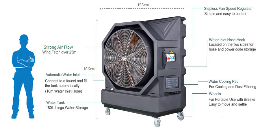 O Ya Suh Dar M602-COOL é um arrefecedor de ar adiabático portátil para aplicações comerciais. Este equipamento faz parte da gama Ya Suh Dar e é especialmente indicado para o arrefecimento de espaços interiores e exteriores. Este sistema Plug & Play proporciona temperaturas agradáveis em fábricas, áreas industriais e de produção, restaurantes e hotéis. É adequado para superfícies até 300 m², com uma capacidade de circulação de ar de 32.000 m³/hora. Um arrefecedor adiabático não só refresca o ar ambiente, como também filtra o pó e as impurezas, contribuindo para um ambiente mais limpo e saudável.