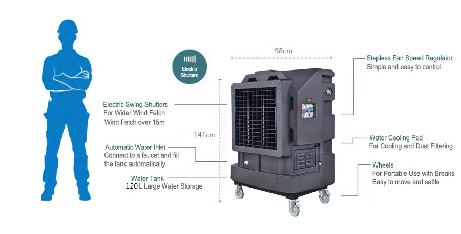 Ya Suh Dar M802-COOL é um arrefecedor evaporativo móvel e adiabático, concebido para utilização comercial. Este equipamento faz parte da série Ya Suh Dar e é especialmente indicado para arrefecer espaços interiores e exteriores. O dispositivo Plug & Play proporciona temperaturas agradáveis em fábricas, áreas industriais e de produção, restaurantes ou hotéis. Adequado para áreas até 160 m², com uma circulação de ar de 18.000 m³/hora. Um arrefecedor adiabático não só arrefece o ar ambiente, como também filtra o pó e as impurezas.