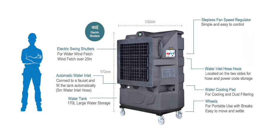 O Ya Suh Dar M703-COOL é um arrefecedor evaporativo móvel, desenvolvido para utilização profissional. Este modelo faz parte da gama Ya Suh Dar e é ideal para arrefecer espaços interiores e exteriores. Com o seu design Plug and Play, garante temperaturas agradáveis em fábricas, áreas industriais e de produção, restaurantes ou hotéis. Adequado para áreas até 250 m² com uma circulação de ar de 25 000 m³ por hora. Além de arrefecer o ar ambiente, um arrefecedor adiabático também filtra poeiras e impurezas.